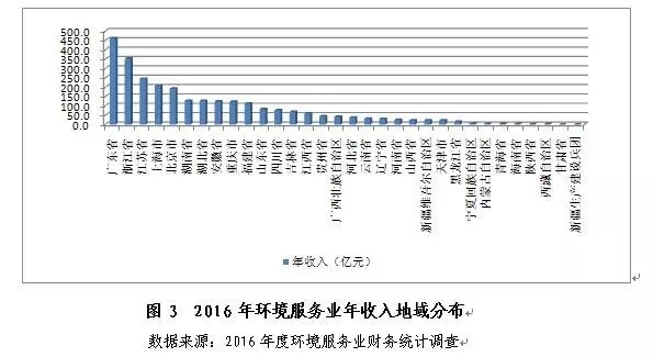 2016年,環(huán)境服務(wù)業(yè)在全國(guó)各地均有分布,且具有較高的區(qū)域集中度。54%以上的年收入來(lái)自于排名前5的地區(qū),僅2%來(lái)自排名最后的10個(gè)?。ㄗ灾螀^(qū)、直轄市),分布格局與2015年基本一致。