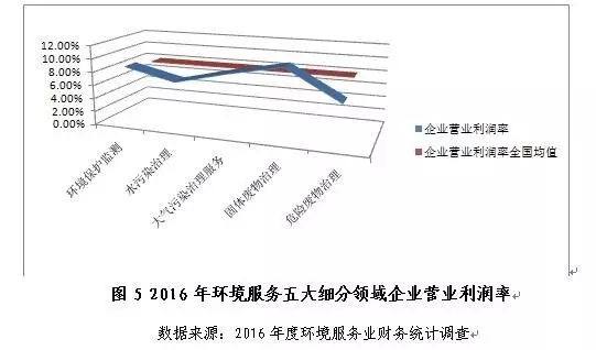 從盈利情況看,環(huán)境保護(hù)監(jiān)測(cè)、水污染治理、大氣污染治理、固體廢物治理和危險(xiǎn)廢物治理五大細(xì)分領(lǐng)域中,僅固體廢物治理和危險(xiǎn)廢物治理領(lǐng)域的2016年?duì)I業(yè)利潤(rùn)率較2015年有所提高,固體廢物治理領(lǐng)域以10.4%的營(yíng)業(yè)利潤(rùn)率成為五領(lǐng)域中盈利能力最高的細(xì)分行業(yè),危險(xiǎn)廢物治理領(lǐng)域營(yíng)業(yè)利潤(rùn)率同比增幅最高,約94.2%;環(huán)境保護(hù)監(jiān)測(cè)、大氣污染治理和水污染治理三領(lǐng)域的2016年?duì)I業(yè)利潤(rùn)率同比分別下滑18.9%、11.3%和9.0%。