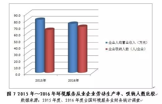 2016年,環(huán)境服務(wù)從業(yè)企業(yè)人均營(yíng)業(yè)收入74.8萬(wàn)元,同比下跌7.5%。從業(yè)企業(yè)勞動(dòng)生產(chǎn)率的小幅下滑可能與企業(yè)吸納從業(yè)人數(shù)的增長(zhǎng)有關(guān),2016年業(yè)內(nèi)企業(yè)平均吸納人數(shù)為70人/企業(yè),同比提高7.2%。