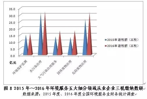 2016年企業(yè)繳納的營(yíng)業(yè)稅金及附加、管理費(fèi)用中的稅金、應(yīng)交增值稅之和同比增長(zhǎng)18.5%,達(dá)125.7億元。五大細(xì)分領(lǐng)域中,水污染治理、危險(xiǎn)廢物治理企業(yè)分別以32.5億元、31.9億元位居五大細(xì)分領(lǐng)域三稅繳納額的前兩位,分別貢獻(xiàn)了三稅總額的25.8%和25.4%。固體廢物治理企業(yè)2016年繳納三稅總額同比增速最大,達(dá)37.0%,這可能歸因于2016年我國(guó)城鎮(zhèn)化的深入推進(jìn),帶動(dòng)了固體廢物處理領(lǐng)域市場(chǎng)空間的不斷擴(kuò)大,以及該領(lǐng)域明顯提高的營(yíng)業(yè)利潤(rùn)率。