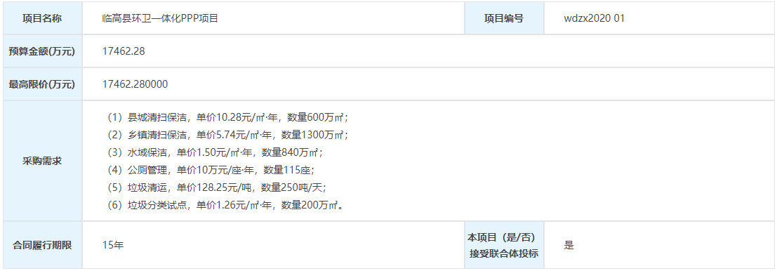 臨高縣環(huán)衛(wèi)一體化PPP項(xiàng)目于2020年12月4日發(fā)布采購(gòu)需求公告,采購(gòu)預(yù)算金額17462.28萬(wàn)元/年,項(xiàng)目采用PPP合作模式,合作周期15年,項(xiàng)目總金額預(yù)計(jì)261934.2萬(wàn)元