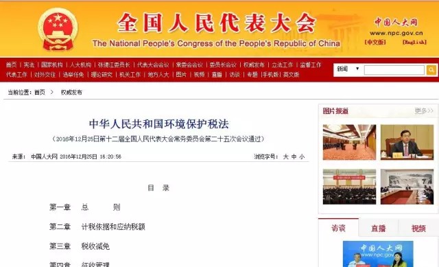 2016年12月25日,曾走過6年立法之路、歷經(jīng)兩次審議的《中華人民共和國環(huán)境保護(hù)稅法》終于由第十二屆全國人民代表大會常務(wù)委員會第二十五次會議通過。習(xí)近平簽發(fā)中華人民共和國第六十一號主席令予以公布,新法自2018年1月1日起施行。