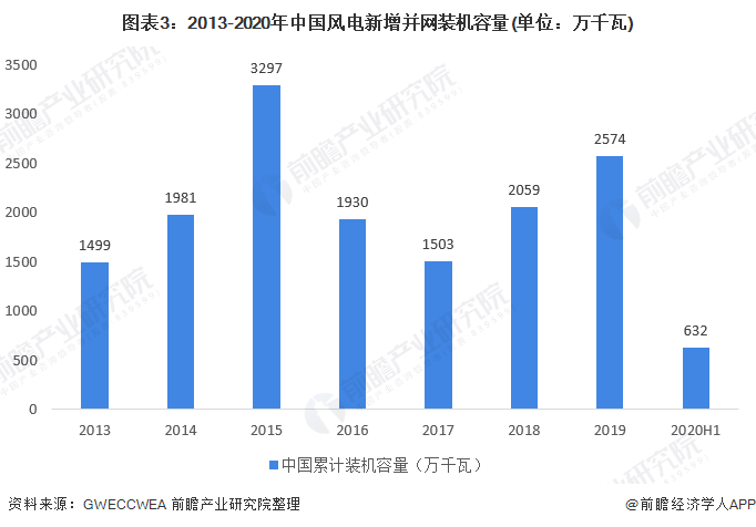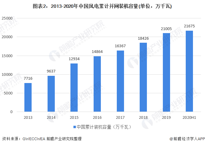 風(fēng)電裝機(jī)容量逐年增長。據(jù)統(tǒng)計,2019年我國風(fēng)電裝機(jī)容量達(dá)到了21005萬千瓦。2020年上半年,我國風(fēng)電裝機(jī)容量達(dá)到了21675萬千瓦,其中新增風(fēng)電并網(wǎng)裝機(jī)容量632萬千瓦。