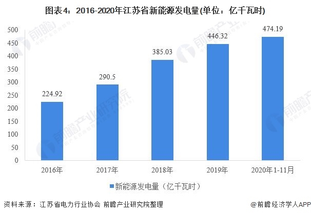 2020年1-11月份,江蘇全省發(fā)電量4533.71億千瓦時(shí),其中新能源發(fā)電量474.19億千瓦時(shí),占全省發(fā)電量的10.46%,份額占比進(jìn)一步提升。