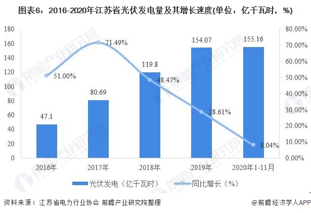 光伏發(fā)電方面,2016-2020年,江蘇省風(fēng)電發(fā)電量高速增長(zhǎng),2016年全省風(fēng)電發(fā)電量?jī)H47.1億千瓦時(shí),到2019年增長(zhǎng)至154.07億千瓦時(shí)。截至2020年11月,全省風(fēng)電發(fā)電量為155.16億千瓦時(shí),同比增長(zhǎng)8.04%,與風(fēng)電發(fā)電量之間的差距進(jìn)一步縮小。