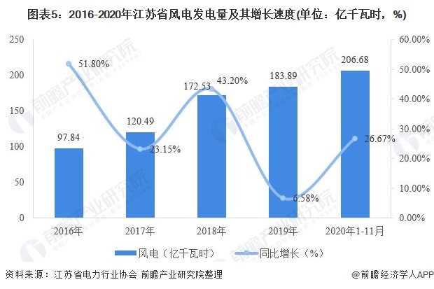 具體到不同類型發(fā)電量來(lái)看,江蘇省新能源發(fā)電量主要來(lái)自風(fēng)電及太陽(yáng)能光伏發(fā)電。2016-2020年,江蘇省風(fēng)電發(fā)電量發(fā)展迅速,2016年全省風(fēng)電發(fā)電量?jī)H97.84億千瓦時(shí),到2019年增長(zhǎng)至183.89億千瓦時(shí)。截至2020年11月,全省風(fēng)電發(fā)電量為206.68億千瓦時(shí),同比增長(zhǎng)26.67%。