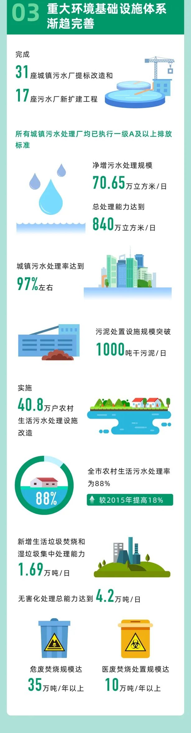 三是重大環(huán)境基礎設施體系漸趨完善。完成31座城鎮(zhèn)污水廠提標改造和17座污水廠新擴建工程,所有城鎮(zhèn)污水處理廠均已執(zhí)行一級A及以上排放標準,凈增污水處理規(guī)模70.65萬立方米/日,總處理能力達到840萬立方米/日,城鎮(zhèn)污水處理率預計97%左右,污泥處置設施規(guī)模突破1000噸干污泥/日。實施40.8萬戶農(nóng)村生活污水處理設施改造,農(nóng)村生活污水處理率為88%,較2015年提高18個百分點。新增生活垃圾焚燒和濕垃圾集中處理能力1.69萬噸/日,無害化處理總能力達到4.2萬噸/日,危廢焚燒規(guī)模達35萬噸/年以上,醫(yī)廢焚燒處置規(guī)模達10萬噸/年以上。