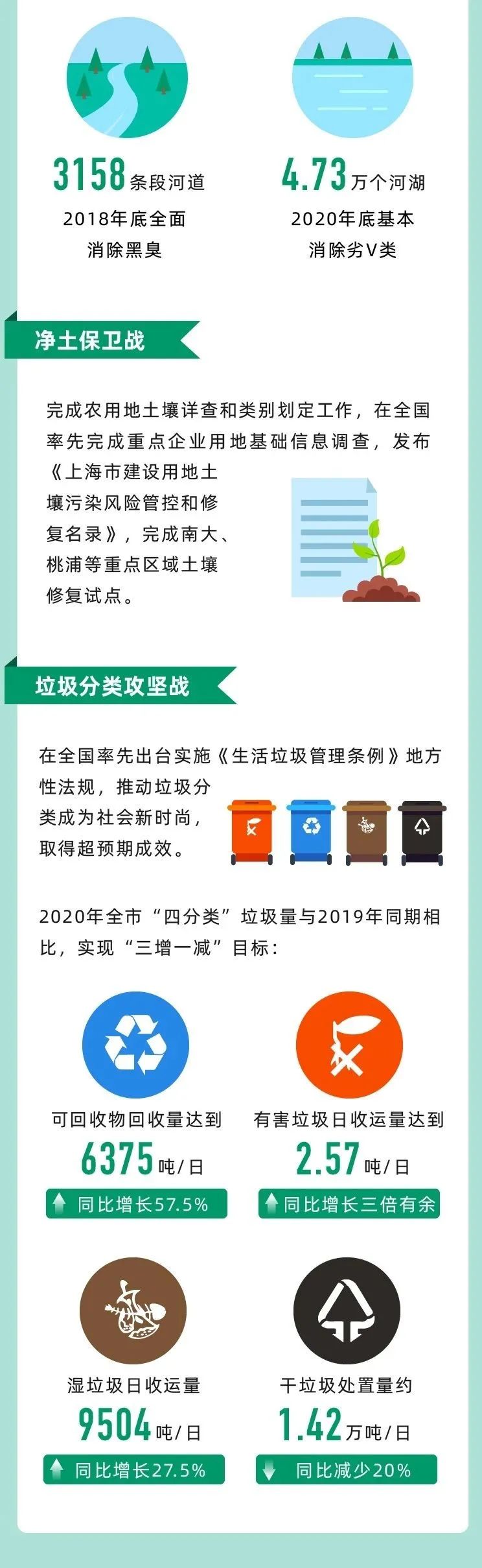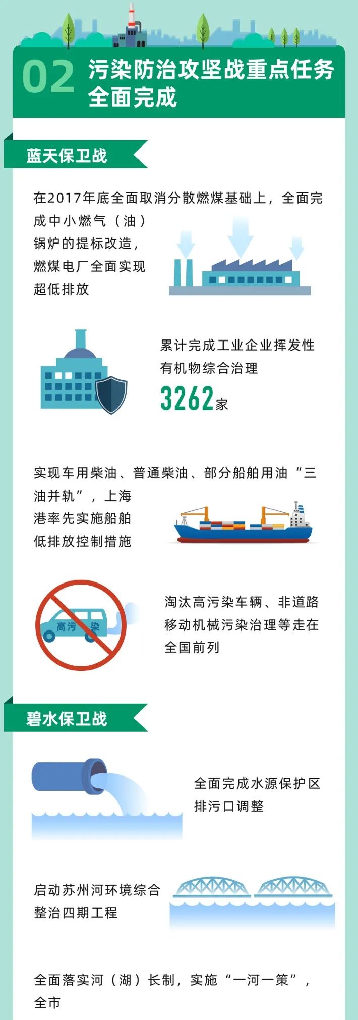二是污染防治攻堅戰(zhàn)重點任務全面完成。藍天保衛(wèi)戰(zhàn)方面,在2017年底全面取消分散燃煤基礎上,全面完成中小燃氣(油)鍋爐的提標改造,燃煤電廠全面實現(xiàn)超低排放;累計完成工業(yè)企業(yè)揮發(fā)性有機物綜合治理3262家;實現(xiàn)車用柴油、普通柴油、部分船舶用油“三油并軌”,上海港率先實施船舶低排放控制措施;淘汰高污染車輛、非道路移動機械污染治理等走在全國前列。碧水保衛(wèi)戰(zhàn)方面,全面完成水源保護區(qū)排污口調(diào)整;啟動蘇州河環(huán)境綜合整治四期工程;全面落實河(湖)長制,實施“一河一策”,3158條段河道2018年底全面消除黑臭,4.73萬個河湖2020年底基本消除劣V類。凈土保衛(wèi)戰(zhàn)方面,完成農(nóng)用地土壤詳查和類別劃定工作,在全國率先完成重點企業(yè)用地基礎信息調(diào)查,發(fā)布《上海市建設用地土壤污染風險管控和修復名錄》,完成南大、桃浦等重點區(qū)域土壤修復試點。垃圾分類攻堅戰(zhàn)方面,在全國率先出臺實施《生活垃圾管理條例》地方性法規(guī),推動垃圾分類成為社會新時尚,取得超預期成效。