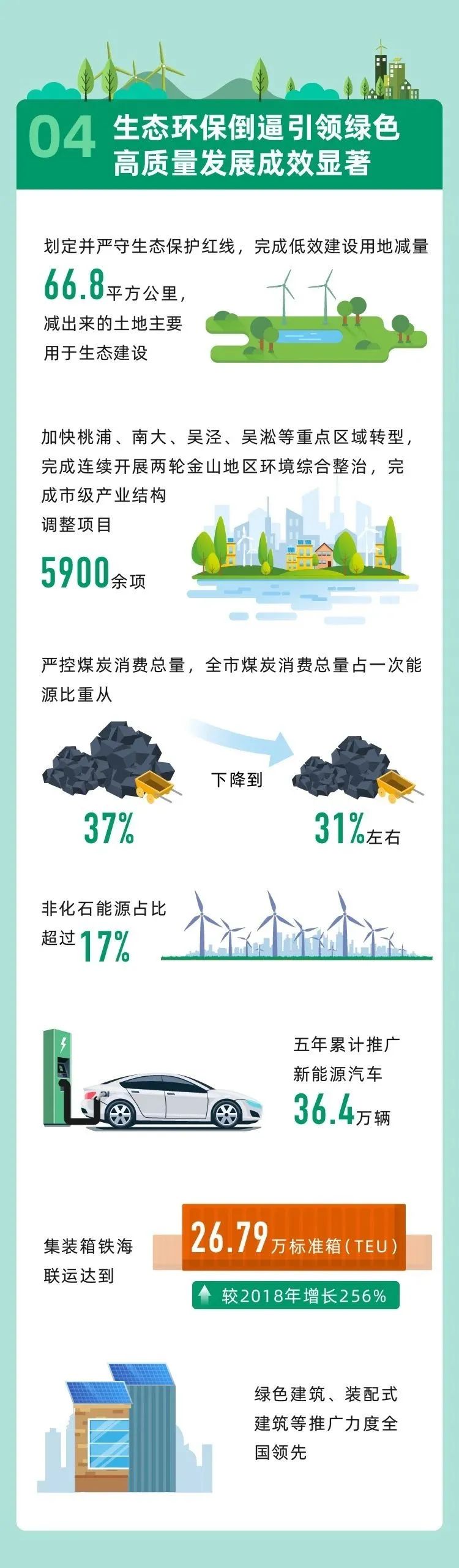 四是生態(tài)環(huán)保倒逼引領綠色高質(zhì)量發(fā)展成效顯著。劃定并嚴守生態(tài)保護紅線,完成低效建設用地減量66.8平方公里,減出來的土地主要用于生態(tài)建設。堅持“四個論英雄”的發(fā)展導向,加快桃浦、南大、吳涇、吳淞等重點區(qū)域轉(zhuǎn)型,完成兩輪金山地區(qū)環(huán)境綜合整治,完成市級產(chǎn)業(yè)結(jié)構(gòu)調(diào)整項目5900余項。嚴控煤炭消費總量,全市煤炭消費總量占一次能源比重從37%下降到31%左右,非化石能源占比超過17%。累計推廣新能源汽車36.4萬輛,集裝箱鐵海聯(lián)運達到26.79萬標準箱,較2018年增長256%。綠色建筑、裝配式建筑推廣力度全國領先。
