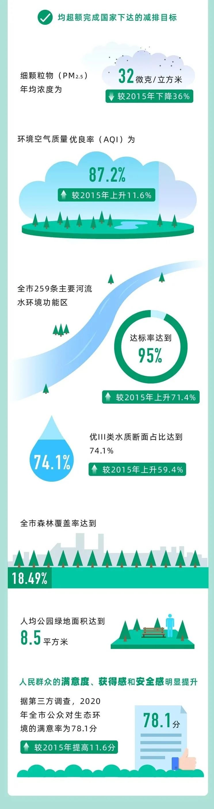 一是生態(tài)環(huán)境質(zhì)量明顯改善。在全市人口、經(jīng)濟、能源消費總量保持增長的同時,主要污染物排放總量持續(xù)下降,生態(tài)環(huán)境質(zhì)量持續(xù)改善。2020年,經(jīng)初步核定,全市化學需氧量、氨氮、二氧化硫和氮氧化物等4項主要污染物排放量分別較2015年削減68.1%、38.1%、46.6%和28.2%,均超額完成國家下達的減排目標。細顆粒物(PM2.5)年均濃度為32微克/立方米,較2015年下降36%;環(huán)境空氣質(zhì)量優(yōu)良率(AQI)為87.2%,較2015年上升11.6個百分點。全市259條主要河流斷面水環(huán)境功能區(qū)達標率為95%,較2015年上升71.4個百分點;優(yōu)III類水質(zhì)斷面占比達74.1%,較2015年上升59.4個百分點。森林覆蓋率達到18.49%,人均公園綠地面積達到8.5平方米。人民群眾的滿意度、獲得感和安全感明顯提升。據(jù)第三方調(diào)查,2020年公眾對生態(tài)環(huán)境的滿意率為78.1分,較2015年提高11.6分。