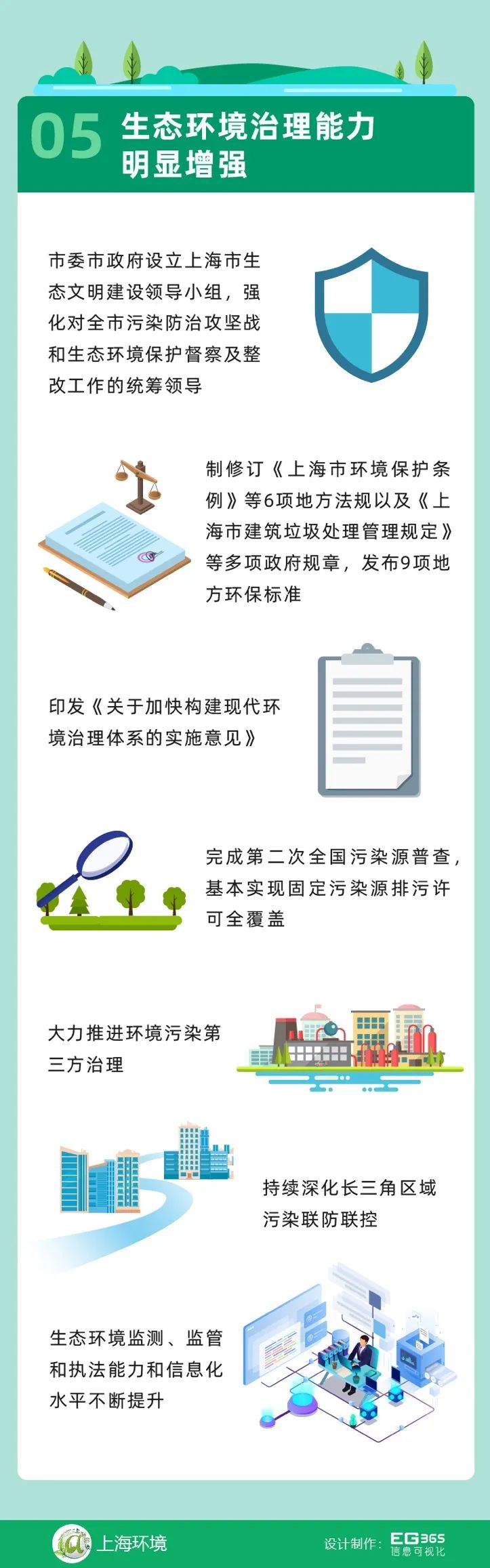 五是生態(tài)環(huán)境治理能力明顯增強。市委市政府設立上海市生態(tài)文明建設領導小組,強化對全市污染防治攻堅戰(zhàn)和生態(tài)環(huán)境保護督察及整改工作的統(tǒng)籌領導,生態(tài)環(huán)境保護“黨政同責、一崗雙責”機制及相應考核問責體系不斷健全完善。制修訂《上海市環(huán)境保護條例》等6項地方法規(guī)以及《上海市建筑垃圾處理管理規(guī)定》等多項政府規(guī)章,發(fā)布9項地方環(huán)保標準。印發(fā)《關于加快構(gòu)建現(xiàn)代環(huán)境治理體系的實施意見》,完成第二次全國污染源普查,基本實現(xiàn)固定污染源排污許可全覆蓋,大力推進環(huán)境污染第三方治理,持續(xù)深化長三角區(qū)域污染聯(lián)防聯(lián)控,生態(tài)環(huán)境監(jiān)測、監(jiān)管和執(zhí)法能力和信息化水平持續(xù)提升。