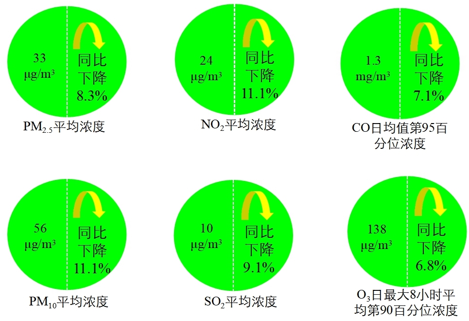 1-12月,全國337個地級及以上城市平均優(yōu)良天數(shù)比例為87.0%,同比上升5.0個百分點;PM2.5平均濃度為33微克/立方米,同比下降8.3%;PM10平均濃度為56微克/立方米,同比下降11.1%;O3平均濃度為138 微克/立方米,同比下降6.8%;SO2平均濃度為10微克/立方米,同比下降9.1%;NO2平均濃度為24 微克/立方米,同比下降11.1%;CO平均濃度為1.3毫克/立方米,同比下降7.1%。