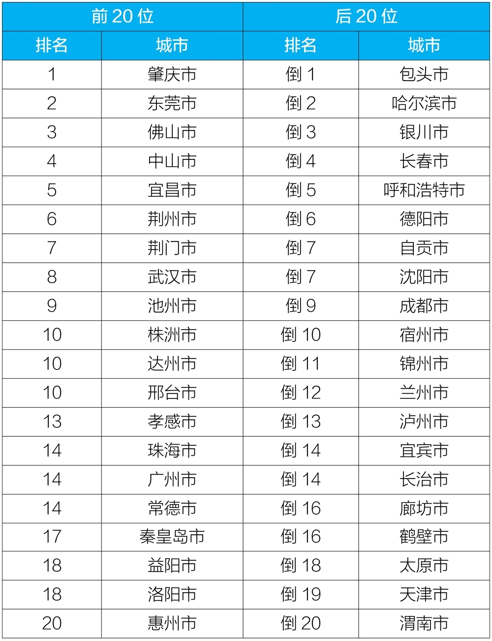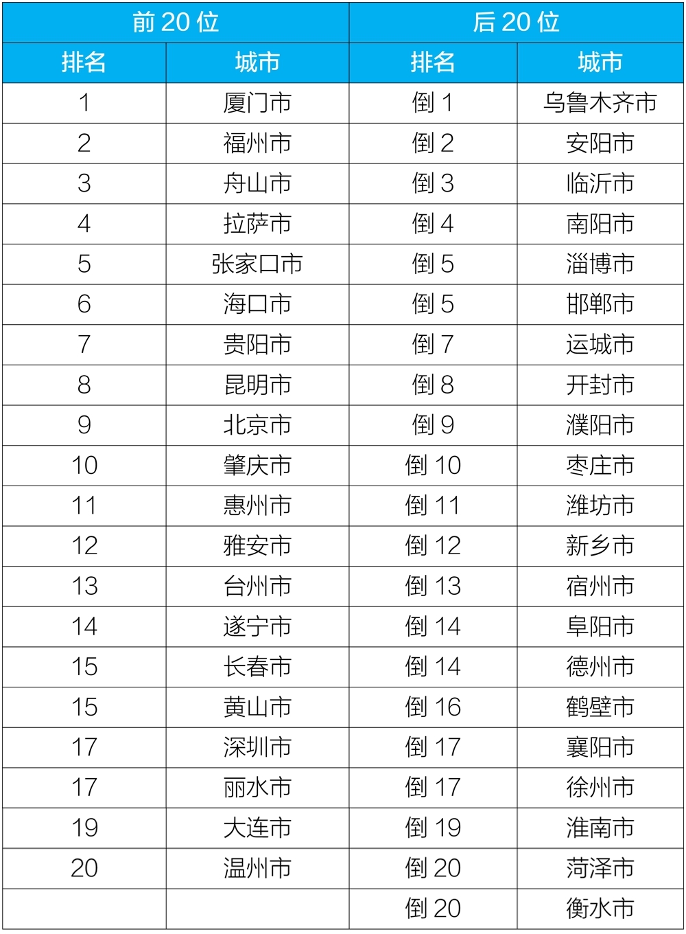 2020年12月168個重點城市排名前20位和后20位城市名單