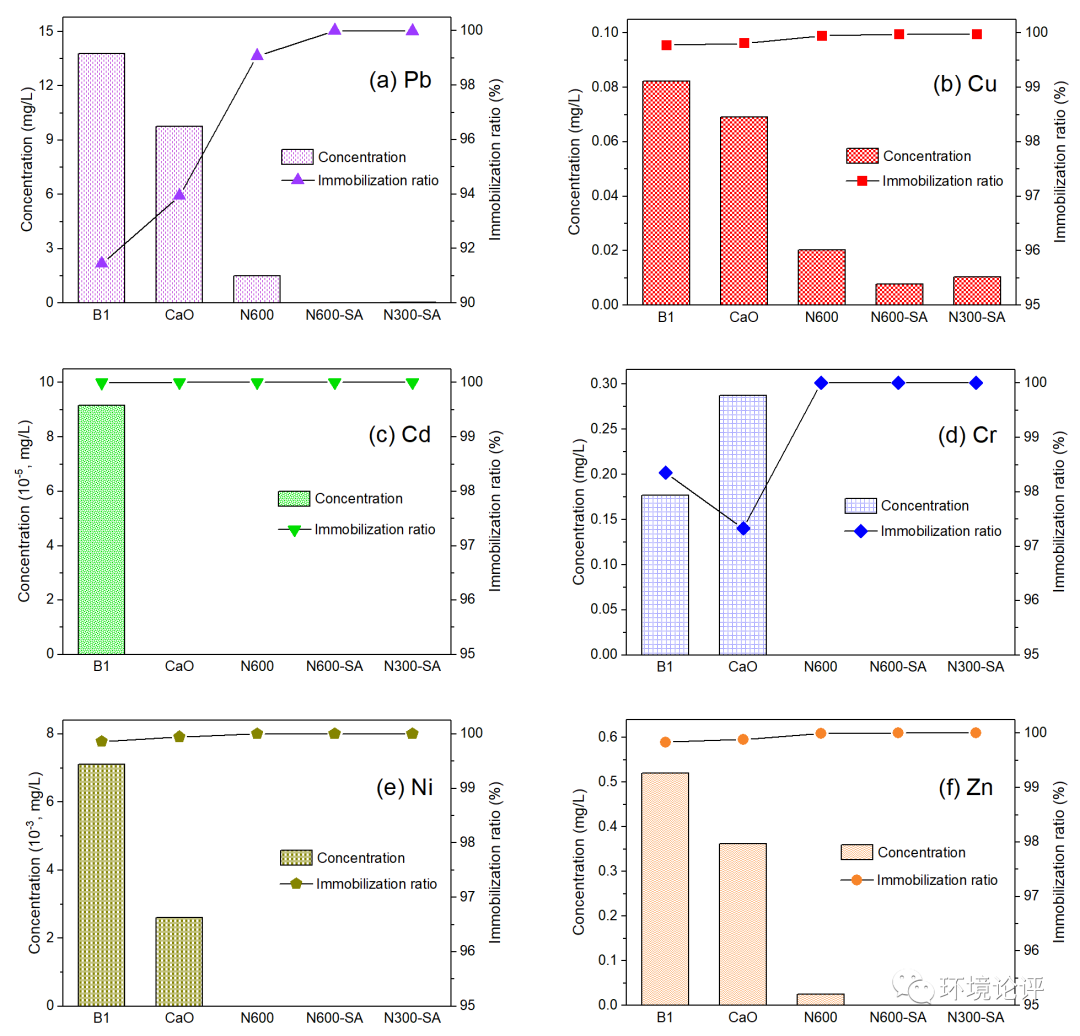 圖|固化穩(wěn)定化前后各實(shí)驗組六種重金屬的浸出濃度與固定率