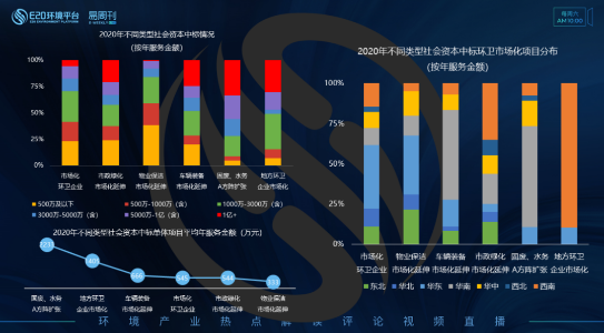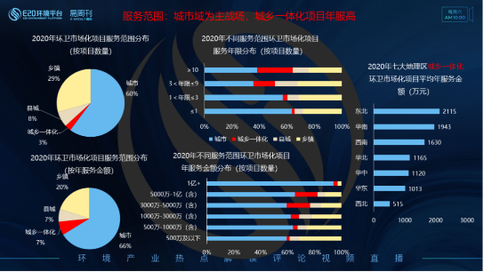 (3)2020年以服務(wù)城市域?yàn)橹鞯沫h(huán)衛(wèi)市場化項(xiàng)目數(shù)量約占到2020年整體的60%,市場份額約占66%。東北地區(qū)單體城鄉(xiāng)一體化項(xiàng)目年服務(wù)金額最高,約2115萬元/年。