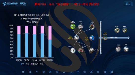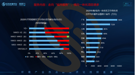 2020年對(duì)于環(huán)衛(wèi)市場而言,“城市管家”、“大市政綜合管養(yǎng) ”、“城市服務(wù)”等關(guān)鍵詞頻出,這類項(xiàng)目往往涵蓋環(huán)衛(wèi)、道路養(yǎng)護(hù)、城市路燈、河道管理、園林綠化、公園管護(hù)等多項(xiàng)服務(wù)。E20研究院將此類項(xiàng)目定義為環(huán)衛(wèi)市場化的橫向一體化項(xiàng)目。將傳統(tǒng)環(huán)衛(wèi)與城市管養(yǎng)的多項(xiàng)服務(wù)進(jìn)行一體化打包,全區(qū)域覆蓋、全流程作業(yè)、精細(xì)化管理,可以適度提升市政、環(huán)衛(wèi)、綠化管護(hù)的水平和質(zhì)量,2020年趨勢更為明顯(左圖)。