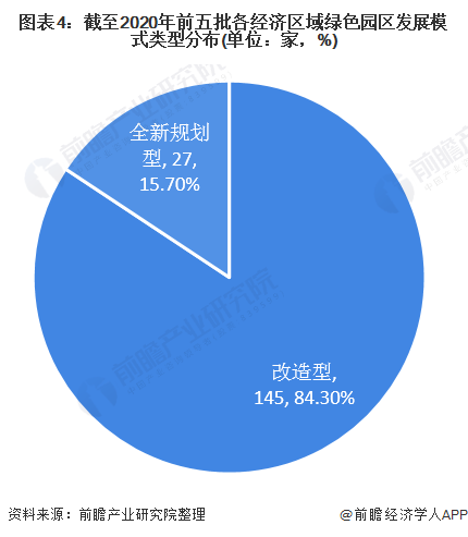 從綠色產(chǎn)業(yè)園區(qū)發(fā)展模式類型分布來看,我國綠色產(chǎn)業(yè)園區(qū)目前仍以原有園區(qū)改造型為主,全新規(guī)劃型占比較少,172家國家級綠色園區(qū)中改造型綠色園區(qū)為145家,占比達84.3%,全新規(guī)劃型綠色園區(qū)為27家,占比為15.7%。