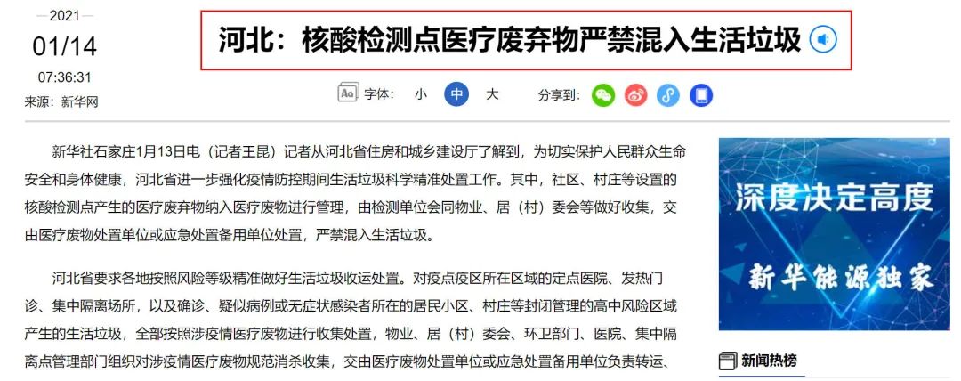 看得出來,其中可疑的傳播途徑之一,就是機(jī)場的拾荒者。而同一時(shí)間,同是在河北省,又恰好發(fā)生了另外一則新聞。1月14日,有網(wǎng)友爆料稱,自己所在的河北廊坊某小區(qū),有核酸檢測樣本被一名拾荒者丟棄在了垃圾桶,只是為了拿走裝核酸樣本的紙箱子。為此,小區(qū)居民不得不排長隊(duì)進(jìn)行了第二次核酸檢測。這則新聞透露出一個(gè)信息,那就是核酸檢測點(diǎn)的醫(yī)療廢棄物(嚴(yán)格說核酸檢測樣本還不能稱之為“醫(yī)廢”)管理確實(shí)可能存在漏洞。一個(gè)尚且有用的核酸檢測樣本,都能被不相干的拾荒者撿走。那如果是沒有用處的醫(yī)療廢棄物,是不是更有可能流入拾荒者的手中?而在廊坊發(fā)生的例子,是否也有可能在石家莊重現(xiàn)?畢竟兩者同處于河北省的管理之下。聯(lián)想到此次石家莊的疫情,一個(gè)客觀存在的事實(shí)是——疫情集中暴發(fā)的幾個(gè)村子都位于石家莊正定國際機(jī)場附近。眾所周知,石家莊機(jī)場是首都機(jī)場重要的分流保障機(jī)場之一,疫情期間承擔(dān)了很多的分流保障任務(wù)。官方信息顯示,2020年,在經(jīng)停分流國際航班保障方面,石家莊機(jī)場被確定為了第一批分流北京國際航班入境點(diǎn)。10個(gè)月以來,該機(jī)場共保障入境航班和包機(jī)86班、入境人員1.77萬人次。雖然,石家莊機(jī)場表示,他們已經(jīng)采取了許多防疫措施,如國際航班保障人員實(shí)行集中住宿、封閉管理,與其他員工物理隔離;每周對處置專區(qū)進(jìn)行常態(tài)化環(huán)境物表檢測,采樣點(diǎn)位置覆蓋頻繁與旅客發(fā)生接觸的服務(wù)設(shè)施以及空調(diào)風(fēng)管、出風(fēng)口,截至目前檢測結(jié)果均為陰性。但是,河北省健康管理學(xué)會(huì)發(fā)布的文章《石家莊疫霾下的三點(diǎn)再思考!》顯示,要認(rèn)識(shí)到管控措施的局限性。雖然國家在海關(guān)、機(jī)場、碼頭都采取了一系列管控措施,對進(jìn)口物資、入境人員都認(rèn)真檢測,但是任何措施都不是萬能的,都可能存在著一定的漏洞。國際通道有可能管控不嚴(yán),或者是人與人的接觸,或者是物與人的接觸,或者是冷鏈產(chǎn)品的搬運(yùn),或者是垃圾廢棄物的處置,都有可能讓病毒有機(jī)可乘,偷偷地跑出來禍害人們。無論哪個(gè)環(huán)節(jié)管控不嚴(yán),都有可能出現(xiàn)問題。事實(shí)上,政府方面已經(jīng)注意到了可能存在的漏洞,并緊急出臺(tái)了相關(guān)規(guī)定。據(jù)新華社報(bào)道,1月13日,記者從河北省住房和城鄉(xiāng)建設(shè)廳了解到,為切實(shí)保護(hù)人民群眾生命安全和身體健康,河北省進(jìn)一步強(qiáng)化了疫情防控期間生活垃圾科學(xué)精準(zhǔn)處置工作。其中,社區(qū)、村莊等設(shè)置的核酸檢測點(diǎn)產(chǎn)生的醫(yī)療廢棄物也納入醫(yī)療廢物進(jìn)行管理,由檢測單位會(huì)同物業(yè)、居(村)委會(huì)等做好收集,交由醫(yī)療廢物處置單位或應(yīng)急處置備用單位處置,嚴(yán)禁混入生活垃圾。河北省要求,各地要按照風(fēng)險(xiǎn)等級(jí)精準(zhǔn)做好生活垃圾收運(yùn)處置。對疫點(diǎn)疫區(qū)所在區(qū)域的定點(diǎn)醫(yī)院、發(fā)熱門診、集中隔離場所,以及確診、疑似病例或無癥狀感染者所在的居民小區(qū)、村莊等封閉管理的高中風(fēng)險(xiǎn)區(qū)域產(chǎn)生的生活垃圾,全部按照涉疫情醫(yī)療廢物進(jìn)行收集處置,物業(yè)、居(村)委會(huì)、環(huán)衛(wèi)部門、醫(yī)院、集中隔離點(diǎn)管理部門組織對涉疫情醫(yī)療廢物規(guī)范消殺收集,交由醫(yī)療廢物處置單位或應(yīng)急處置備用單位負(fù)責(zé)轉(zhuǎn)運(yùn)、處置。除以上情形的其他高、中風(fēng)險(xiǎn)區(qū)域產(chǎn)生的生活垃圾,先經(jīng)消毒后再進(jìn)行收運(yùn)并焚燒等無害化處置。低風(fēng)險(xiǎn)區(qū)域的生活垃圾,先經(jīng)消毒后再收運(yùn)處置,做好垃圾桶、垃圾運(yùn)輸車、垃圾轉(zhuǎn)運(yùn)站、垃圾焚燒廠(填埋場)各環(huán)節(jié)的消殺工作,嚴(yán)禁收運(yùn)未經(jīng)消殺的生活垃圾。同時(shí),河北省還強(qiáng)化了口罩、手套等廢棄物管理。嚴(yán)格按照相關(guān)要求,設(shè)置廢棄口罩、手套收集專用桶,分類投放、集中收集、密閉轉(zhuǎn)運(yùn)、焚燒處理。社區(qū)、村莊、物業(yè)企業(yè)等主動(dòng)配合環(huán)衛(wèi)主管部門做好廢棄口罩、手套單獨(dú)收集、交接登記工作,完善各環(huán)節(jié)交接臺(tái)賬,嚴(yán)防丟失、遺散。亡羊補(bǔ)牢,未為晚也。希望河北省的這一教訓(xùn),也能引起其他省份的注意。從公開信息看,總的來說,目前石家莊的醫(yī)療廢棄物處置已基本到位。1月16日,在第12場新冠肺炎疫情防控工作新聞發(fā)布會(huì)上,石家莊市生態(tài)環(huán)境局副局長冀平表示,按照疫情防控的要求,新冠肺炎患者收治定點(diǎn)醫(yī)院、發(fā)熱病人篩查定點(diǎn)醫(yī)院、集中隔離醫(yī)學(xué)觀察場所、發(fā)熱門診、發(fā)現(xiàn)確診或疑似病例的居民小區(qū)(村莊)、核酸檢測點(diǎn)產(chǎn)生的醫(yī)療廢物(包括口罩、防護(hù)服、隔離衣、手套等)和生活垃圾,已經(jīng)全部納入新冠醫(yī)療廢物管理范圍。目前,石家莊市涉疫醫(yī)療廢物實(shí)施24小時