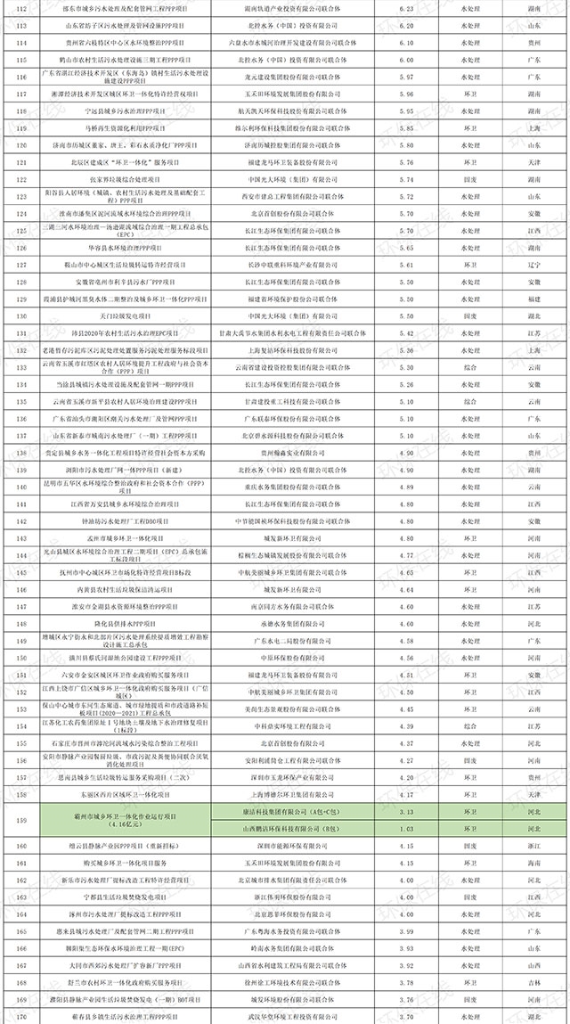 其中,超過(guò)百億的中標(biāo)項(xiàng)目有4個(gè),分別為東莞市各鎮(zhèn)街東江下游片區(qū)水污染綜合治理工程污水收集系統(tǒng)完善工程PPP項(xiàng)目(146.38億元)、唐山全域治水清水潤(rùn)城縣區(qū)工程PPP項(xiàng)目(5個(gè)標(biāo)段共計(jì)118億元)、武漢長(zhǎng)江新城起步區(qū)基礎(chǔ)設(shè)施工程PPP項(xiàng)目(117.2億元),和大澤湖生態(tài)智慧城綜合開發(fā)建設(shè)項(xiàng)目社會(huì)投資合作者采購(gòu)項(xiàng)目(100億元)。