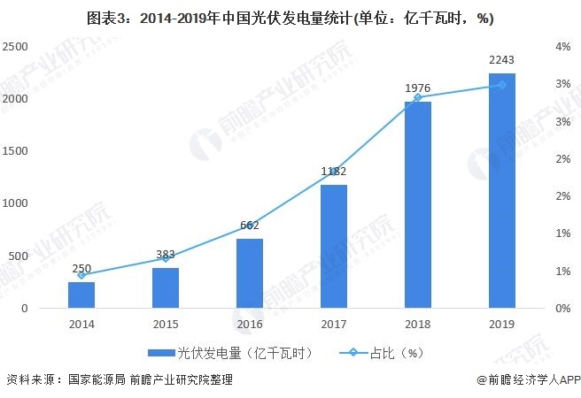 從我國(guó)光伏發(fā)電量上看,2014以來(lái),中國(guó)光伏發(fā)電量呈逐年上升趨勢(shì),占總發(fā)電量比重逐年上升。2019年,全國(guó)光伏發(fā)電量2243億千瓦時(shí),同比增長(zhǎng)13.3%,約占總發(fā)電量的3%。