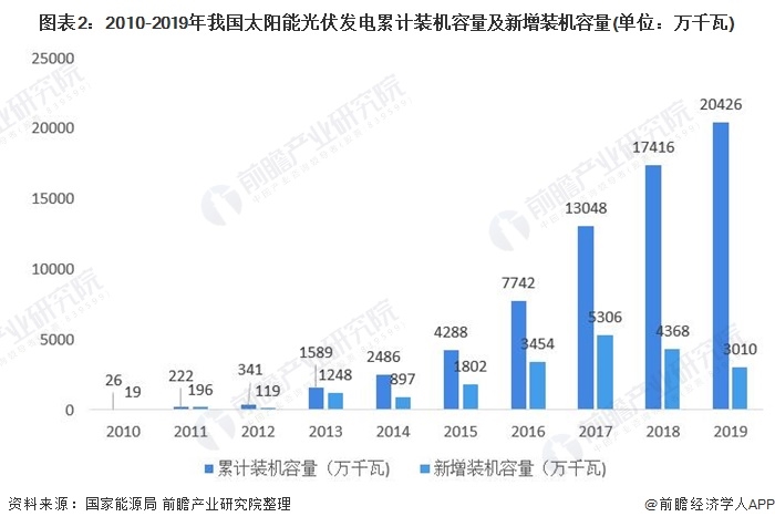 從累計(jì)裝機(jī)容量上看,2010年以來(lái),我國(guó)太陽(yáng)能光伏發(fā)電累計(jì)裝機(jī)容量逐年上升。從新增裝機(jī)容量上看,2010-2017年,我國(guó)太陽(yáng)能光伏發(fā)電新增裝機(jī)容量逐年上升,2018年與2019年開(kāi)始下降。