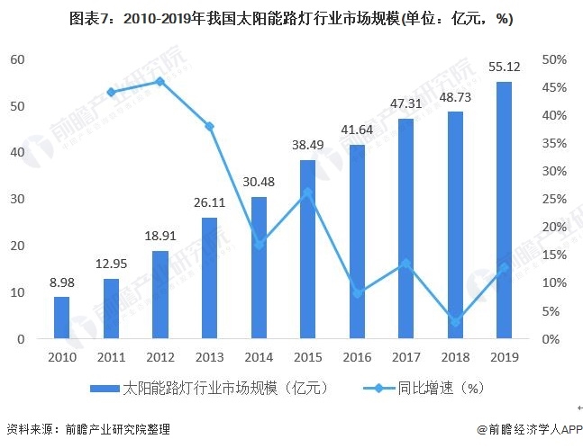 以我國(guó)太陽(yáng)能照明中占比較大的太陽(yáng)能路燈為例。太陽(yáng)能路燈可以降低照明用電量,是節(jié)省能源的重要途徑。受“綠色照明工程”的推動(dòng),近年來(lái)我國(guó)太陽(yáng)能路燈市場(chǎng)一直保持增長(zhǎng),2019年我國(guó)太陽(yáng)能路燈市場(chǎng)規(guī)模達(dá)到55.12億元,同比增長(zhǎng)12.86%。