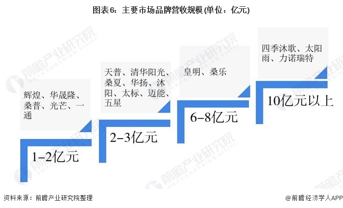 隨著大批太陽(yáng)能企業(yè)的相繼倒閉和退出,太陽(yáng)能熱水器市場(chǎng)份額進(jìn)一步向大中品牌靠攏,品牌格局日漸明晰。目前,我國(guó)太陽(yáng)能熱水器企業(yè)逐步形成四個(gè)梯隊(duì),其中,日出東方旗下?lián)碛刑?yáng)雨和四季沐歌兩大品牌以及力諾瑞特等三家太陽(yáng)能熱水器代表企業(yè)處于第一梯隊(duì),營(yíng)收規(guī)模均達(dá)10億元以上。