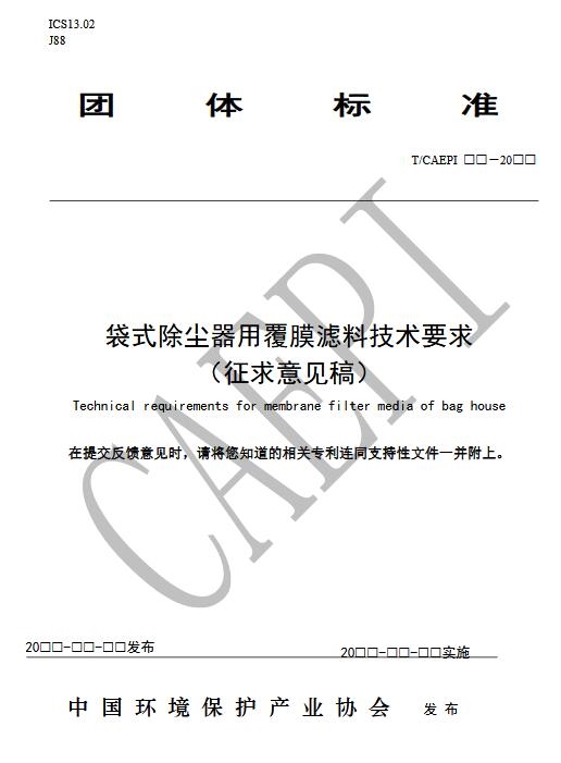 關(guān)于征求中國(guó)環(huán)境保護(hù)產(chǎn)業(yè)協(xié)會(huì)標(biāo)準(zhǔn)《袋式除塵器用覆膜濾料》意見的函