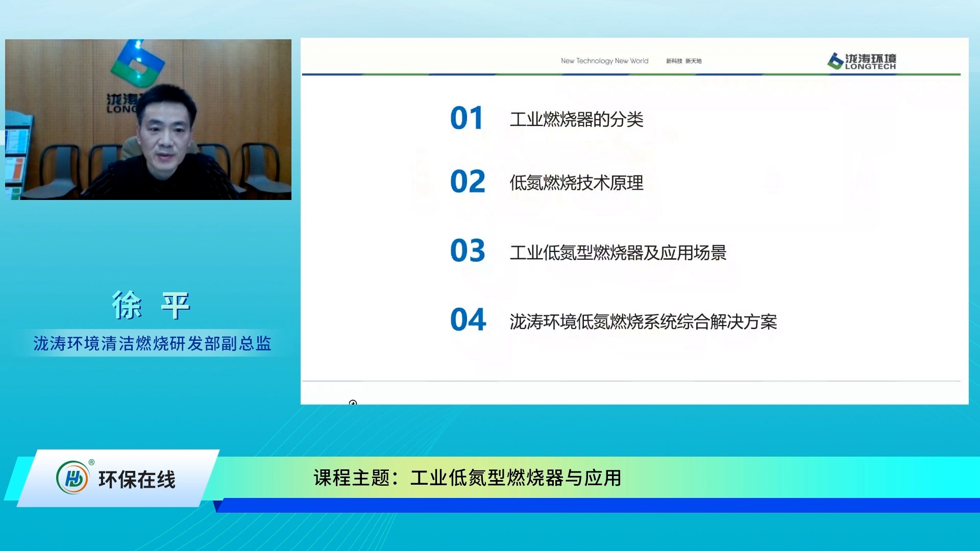課程中,深耕環(huán)保行業(yè)尤其是清潔燃燒領(lǐng)域多年的徐平老師從“工業(yè)燃燒器的分類”“低氮燃燒技術(shù)原理”“工業(yè)低氮型燃燒及應(yīng)用”“瀧濤環(huán)境低氮燃燒系統(tǒng)綜合解決方案”4大部分進(jìn)行了分享解讀,滿滿都是干貨。