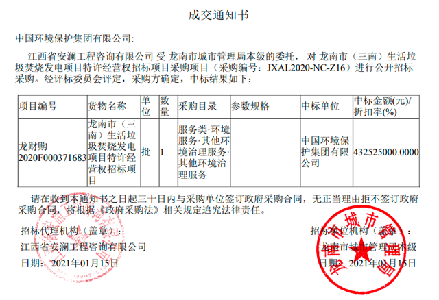 直至2020年1月15日,中國(guó)固廢網(wǎng)從E20環(huán)境平臺(tái)標(biāo)訊采集系統(tǒng)E標(biāo)通獲悉,江西省龍南市(三南)生活垃圾焚燒發(fā)電項(xiàng)目特許經(jīng)營(yíng)權(quán)招標(biāo)項(xiàng)目公布中標(biāo)結(jié)果,中國(guó)環(huán)境保護(hù)集團(tuán)有限公司中標(biāo)該項(xiàng)目,中標(biāo)金額:432525000元,項(xiàng)目服務(wù)時(shí)間30年。