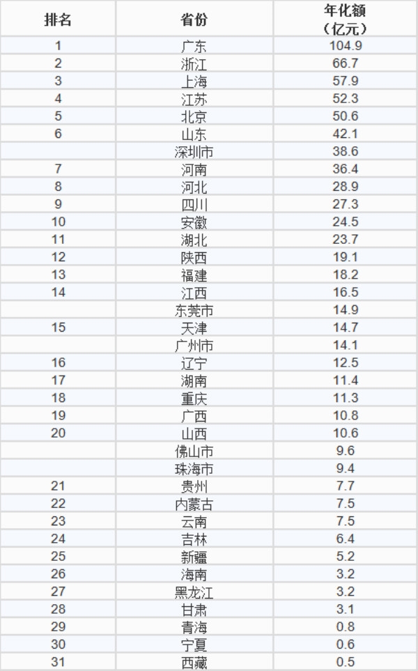 備注:廣東省5個年度開標環(huán)衛(wèi)項目年化額10億級城市在全國省份排名中的位置。