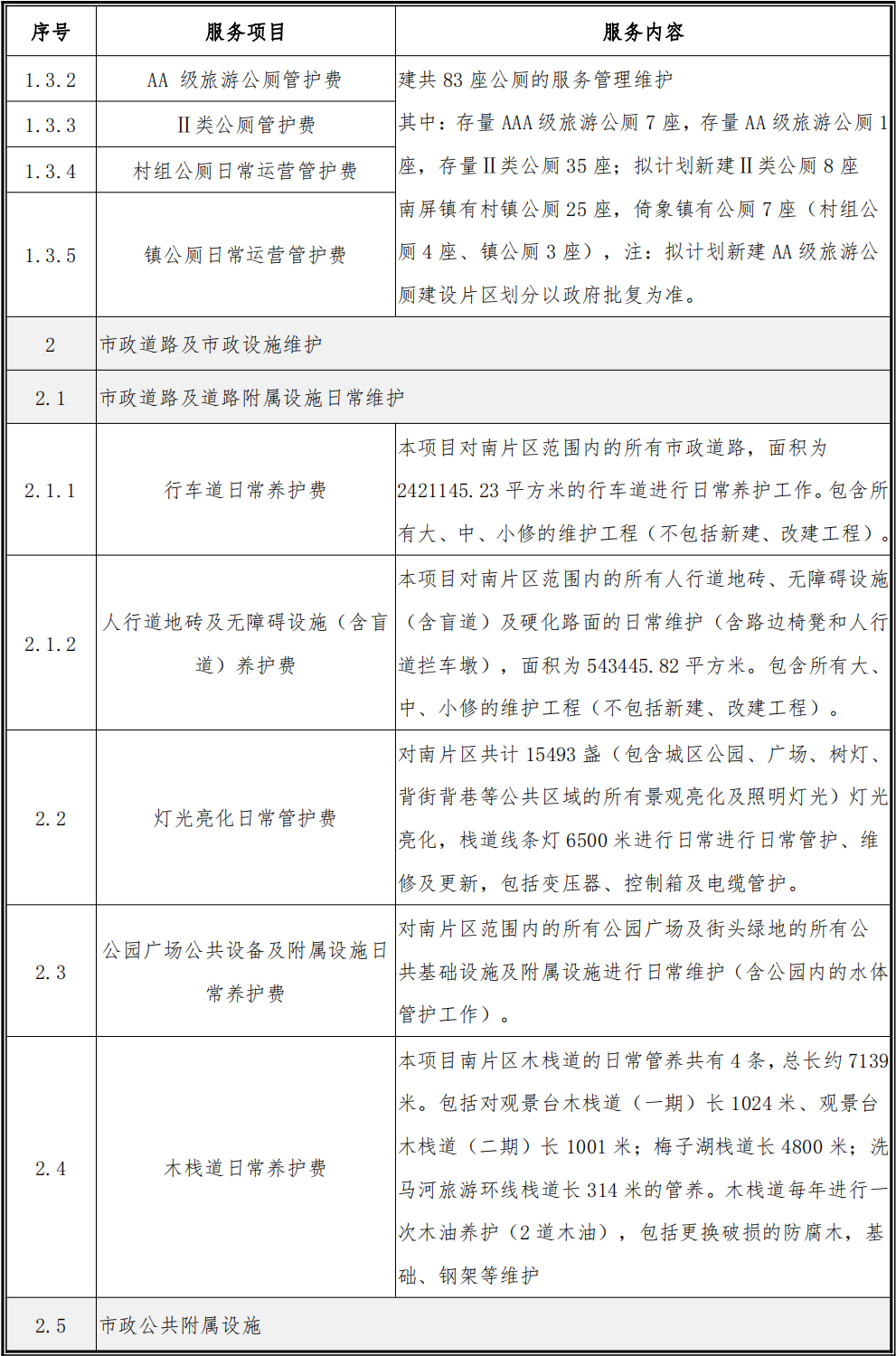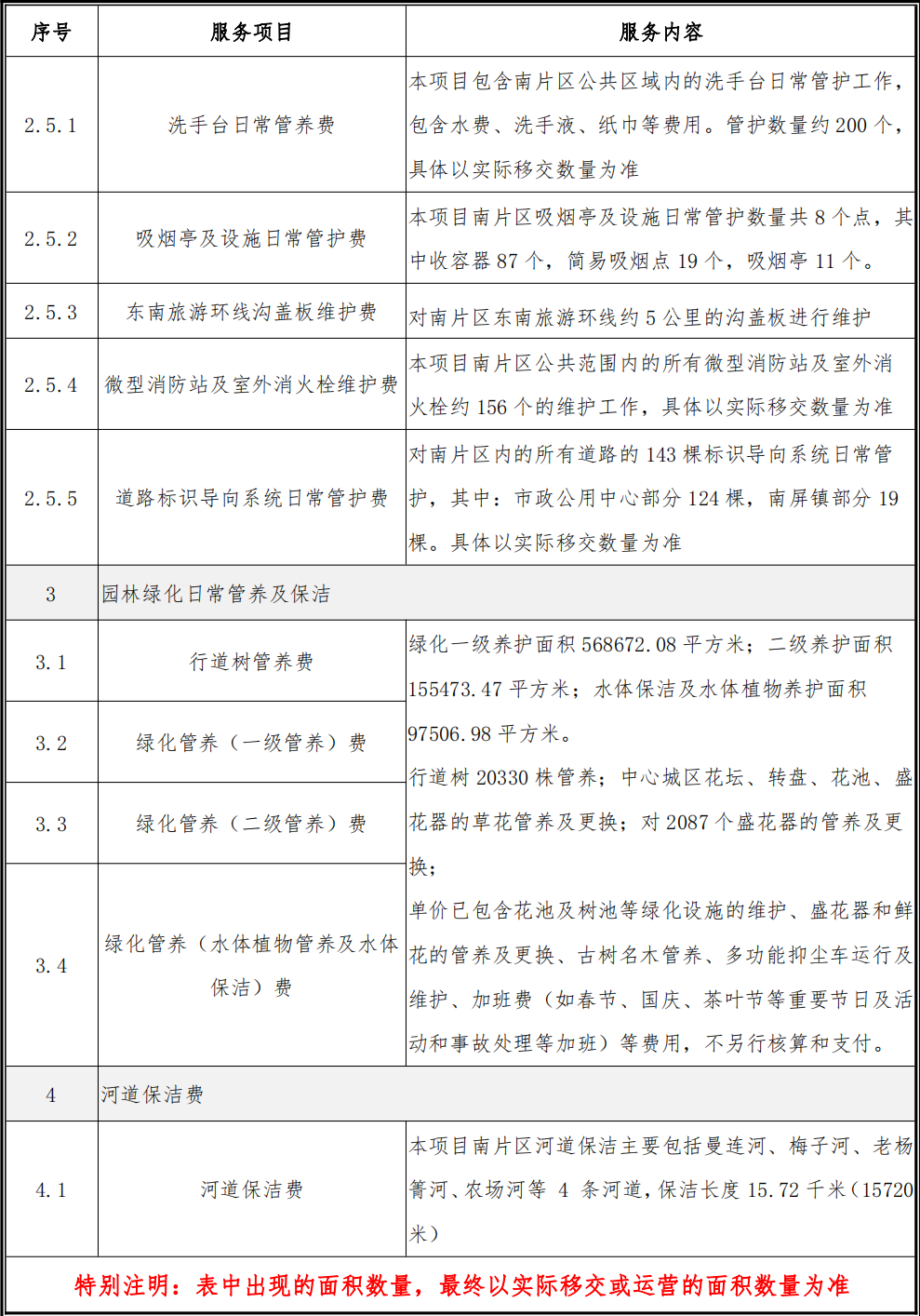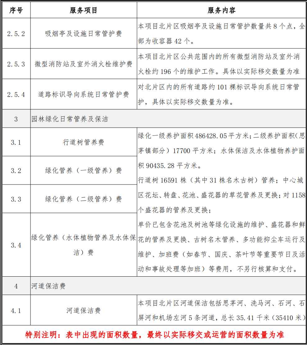 本項(xiàng)目服務(wù)內(nèi)容包括環(huán)境衛(wèi)生清掃保潔、道路及市政設(shè)施日常管護(hù)、園林綠化日常管養(yǎng)及河道保潔等。