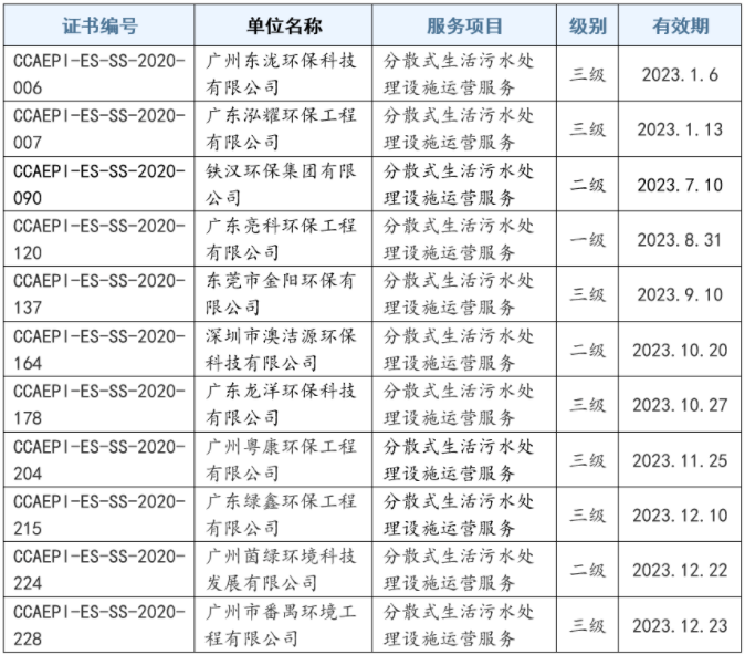 2020年廣東省通過分散式生活污水處理設(shè)施運營服務(wù)認證名單