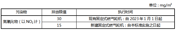 現(xiàn)有固定式燃氣輪機自2023年1月1日起執(zhí)行表1規(guī)定的氮氧化物排放限值。新建固定式燃氣輪機自本標準實施之日起執(zhí)行表1規(guī)定的氮氧化物排放限值。新建固定式燃氣輪機煙囪高度及距離周邊住宅的距離按批復(fù)的環(huán)境影響報告書(表)確定。