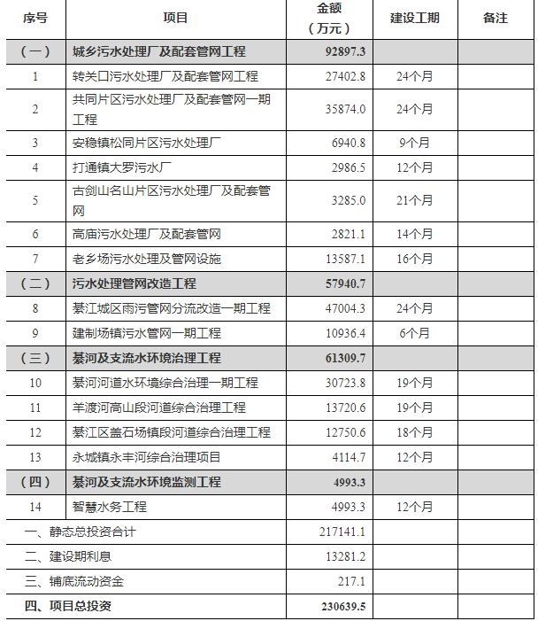 綦江區(qū)綦河流域水環(huán)境綜合治理(一期)PPP項(xiàng)目圍繞綦河流域綜合治理和可持續(xù)發(fā)展,合法依歸重點(diǎn)實(shí)施污水處理廠(站)、雨污管網(wǎng)、環(huán)境治理、智慧水務(wù)等建設(shè)內(nèi)容。本項(xiàng)目共包含四大類(lèi)14個(gè)子項(xiàng)目,項(xiàng)目可研批復(fù)項(xiàng)目總投資約為230639.5萬(wàn)元,其中建安工程費(fèi)用合計(jì)173431萬(wàn)元,工程建設(shè)其它費(fèi)用28408萬(wàn)元,預(yù)備費(fèi)用15302.1萬(wàn)元,建設(shè)期利息13281.2萬(wàn)元,鋪底流動(dòng)資金221.5萬(wàn)元。