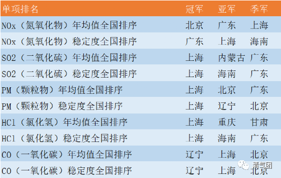 上海在六個(gè)單項(xiàng)中,均斬獲冠軍,同時(shí)也出現(xiàn)在其余四項(xiàng)的前三甲中,綜合煙氣控制能力遙遙領(lǐng)先全國(guó)其他省份。