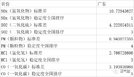 如,廣東省的五項(xiàng)污染物穩(wěn)定度標(biāo)準(zhǔn)差與加權(quán)排序分為