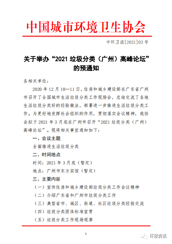 2021年3月底,由中國城市環(huán)境衛(wèi)生協(xié)會(huì)主辦,中環(huán)協(xié)垃圾分類專業(yè)委員會(huì)、廣東省環(huán)境衛(wèi)生協(xié)會(huì)、住建部環(huán)境衛(wèi)生工程技術(shù)研究中心共同承辦的2021 垃圾分類(廣州)高峰論壇將在珠江之畔盛大開幕!