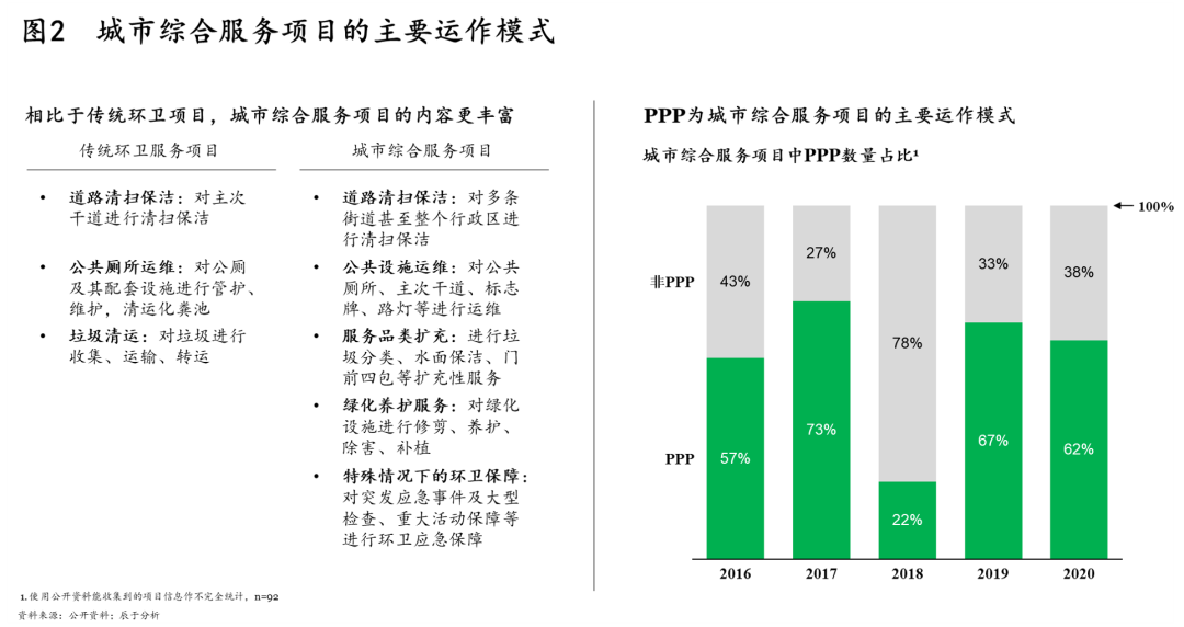 其二,PPP模式的采用,利用社會資本解決環(huán)衛(wèi)一體化項目的資金難題成為可能。相比于傳統(tǒng)環(huán)衛(wèi)項目,城市綜合服務項目的內容更為豐富,對資金的要求也相應提升,PPP模式的應用為有效盤活現(xiàn)有環(huán)衛(wèi)資產(chǎn)提供思路,其也成為城市綜合服務項目的主要運作模式,催生新一批的環(huán)衛(wèi)大單(如圖2)。