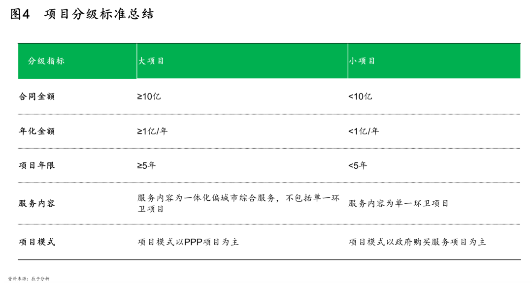 基于已有項目數(shù)據(jù),辰于從合同金額、年化金額、項目年限、服務內容、項目模式這五個分級標準對“大項目”進行界定區(qū)分(如圖4)。一般而言,滿足以下條件之一的環(huán)衛(wèi)項目即可稱為“大項目”:合同金額在10億以上;年化金額在1億以上;合作年限在5年以上。