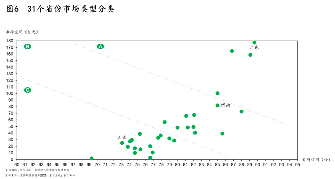 環(huán)衛(wèi)大單的產(chǎn)生不僅需要足夠的市場空間,而且需要當?shù)卣休^強的財政支付能力,辰于采用市場空間和政府信用雙維度分析,建立以環(huán)衛(wèi)大單為目標的區(qū)域評估模型(如圖6)。其中,東部省份(如廣東等)市場空間大,足以孕育出足夠的大金額項目,且政府信用相對較好,財政支付能力強,債務風險低。關注大單的企業(yè)可以在該類地區(qū)多拿項目,并與政府保持密切的溝通和聯(lián)系,通過集群效應、中心輻射效應,與政府合力催生出大項目。