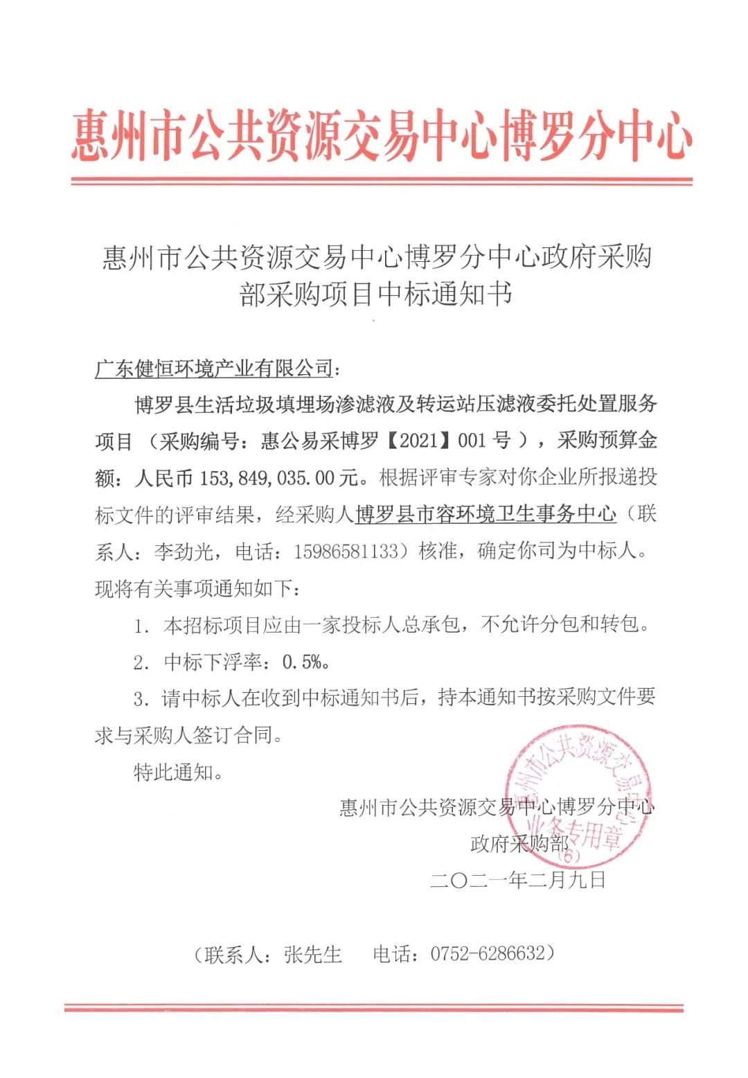 新春開門紅,牛年迎喜氣!健恒環(huán)境在2021年強勢開局,中標(biāo)博羅縣生活垃圾填埋場滲濾液及轉(zhuǎn)運站壓濾液委托處置服務(wù)項目。該項目是健恒環(huán)境成立以來中標(biāo)金額最大的項目。