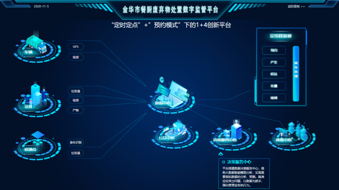 在政府監(jiān)管層面,依托餐廚垃圾信息化管理平臺(tái),把產(chǎn)生點(diǎn)、收運(yùn)單位、收運(yùn)車輛、處置終端通過(guò)技術(shù)手段進(jìn)行智能聯(lián)網(wǎng),形成餐廚垃圾智能監(jiān)控網(wǎng)絡(luò),及時(shí)發(fā)現(xiàn)并快速處理餐廚垃圾物收運(yùn)處置過(guò)程中違規(guī)行為;通過(guò)成熟的信息技術(shù)手段,構(gòu)建大數(shù)據(jù)智能分析模型,使餐廚垃圾管理實(shí)現(xiàn)全程科學(xué)化監(jiān)控及實(shí)時(shí)管理,輔助分析決策。