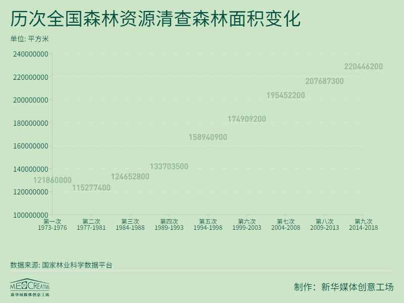 從1973年到2018年,在45年時(shí)間里,全國森林面積增長了98586200平方米,相當(dāng)于增加了約13808個(gè)標(biāo)準(zhǔn)足球場的面積。