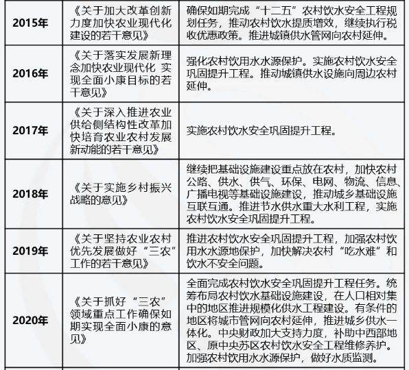 其中,農(nóng)村供水問題關(guān)系到廣大農(nóng)民群眾最基本的生活狀況和農(nóng)村產(chǎn)業(yè)發(fā)展的空間,是鄉(xiāng)村振興非常重要的前提條件。自然,每年的中央一號文件都會對農(nóng)村飲水和城鄉(xiāng)供水一體化做出重點要求和相關(guān)工作部署,可見我國對農(nóng)村飲用水安全的重視程度之高。根據(jù)中央一號文件內(nèi)容側(cè)重點的變化,可以看出我國農(nóng)村飲用水工作在不同階段的整體進(jìn)展和發(fā)展脈絡(luò)。