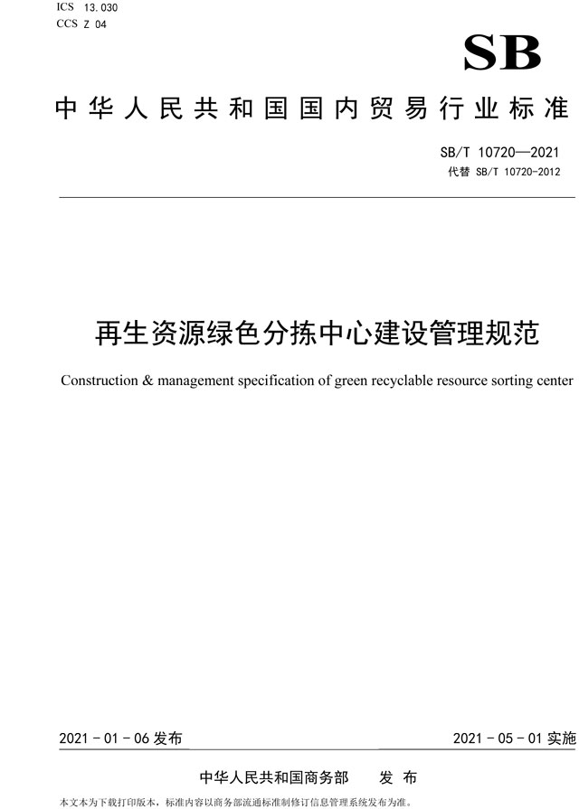 相關(guān)資料下載:《再生資源綠色分揀中心建設(shè)管理規(guī)范》(SB/T 10720-2021).p