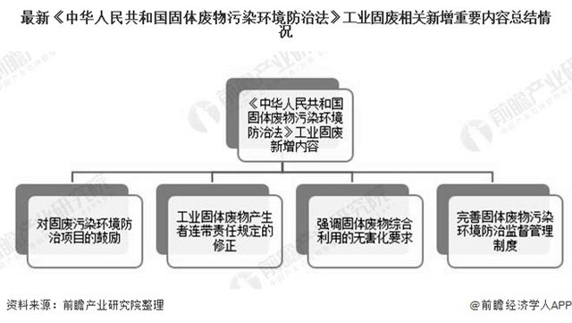2020年4月29日,十三屆全國(guó)人大常委會(huì)第十七次會(huì)議審議通過(guò)了修訂后的固體廢物污染環(huán)境防治法,自2020年9月1日起施行,對(duì)工業(yè)固廢新增了四大類內(nèi)容可歸結(jié)為:對(duì)固廢污染環(huán)境防治項(xiàng)目的鼓勵(lì)、工業(yè)固體廢物產(chǎn)生者連帶責(zé)任規(guī)定的修正、強(qiáng)調(diào)固體廢物綜合利用的無(wú)害化要求、完善固體廢物污染環(huán)境防治監(jiān)督管理制度。