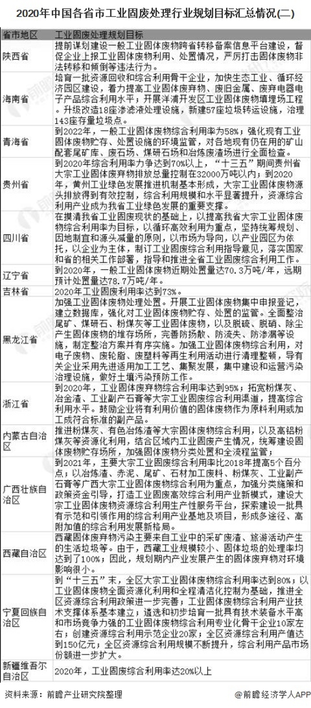 根據(jù)前瞻產(chǎn)業(yè)研究院匯總,截至2020年12月我國(guó)已經(jīng)有30多個(gè)省市地區(qū)就工業(yè)固廢處理的發(fā)展給出了相關(guān)的指導(dǎo)意見(jiàn)以及配套的措施,其中19個(gè)省份均已制定工業(yè)固廢處理綜合利用率階段性目標(biāo),并陸續(xù)出臺(tái)具體細(xì)化的地方性工業(yè)固廢處理政策扶持行業(yè)發(fā)展。