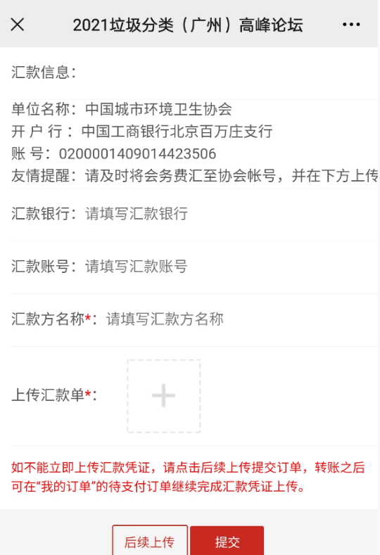(溫馨提示:匯款請(qǐng)務(wù)必備注“單位名稱+垃圾分類高峰論壇”,并在匯款后在線提交匯款單)