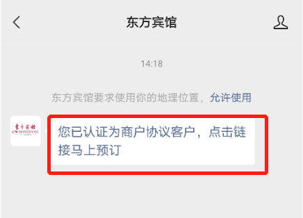 2、關(guān)注公眾號(hào)后點(diǎn)擊對(duì)話框鏈接進(jìn)入酒店預(yù)定頁(yè)面;